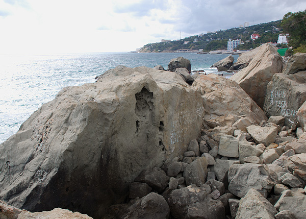 Набережной, как таковой, в Алупке нет. Есть пирс, от которого плавают (или ходят, как кому) кораблики на Гурзуф (билет 70 грн. в одну сторону). Все остальное побережье занято либо пляжами (зачастую закрытыми санаторными), либо живописными валунами. Среди которых выделяется скала Айвазовского, связанная с именем известного мариниста, рисовавшего местные красоты.