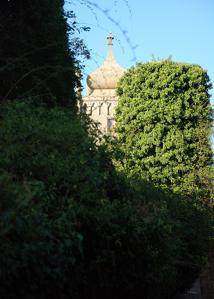 Суровый, английский по духу неоготический задний (северный) фасад, разбавленный дымовыми «минаретными» трубы, резными карнизами и шпилями.