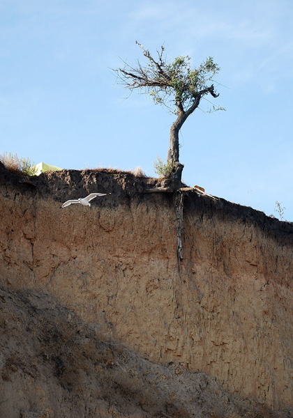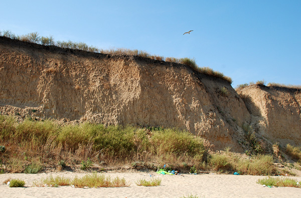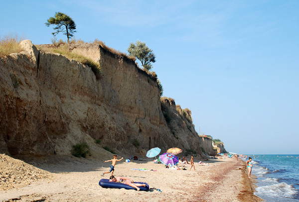 Блюдо степи с желтоватыми выгоревшими травами, резко обрывающееся к морю красноватыми глиняными склонами. Мягкий песок, перемежающийся сотнями непременных ракушек, жарящиеся на солнце водоросли, нежный отсвет морской воды, долгожданная тень от склона, силуэты чаек, ищущих «кусочек пожирнее». Плюс между близнецами на удивление немного людей. Скорее всего потому, что куротникам лень брести по берегу от любимых лежаков целых пять, а то и десять минут. А мы лениться не будем.