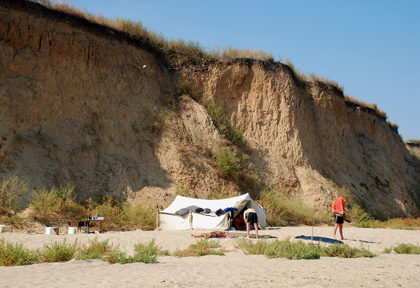 Как и те, кто отдыхает дикарем наверху над морем, или прямо на пляже. Палатка — верный домик туриста, навес от солнца, раскладной табурет, примус – и плевать на поднебесные цены на постой и ворчливых соседей. Сидишь в тенечке, созерцаешь владения Нептуна. Надоело – полсотни шагов по кривой тропинке вниз и уже в объятьях самого Черного моря на свете.