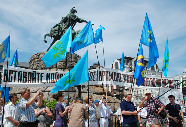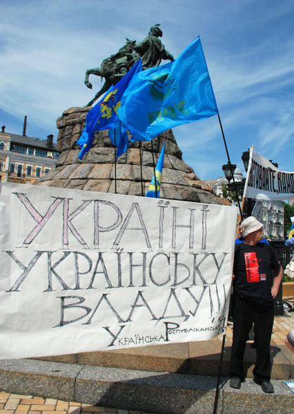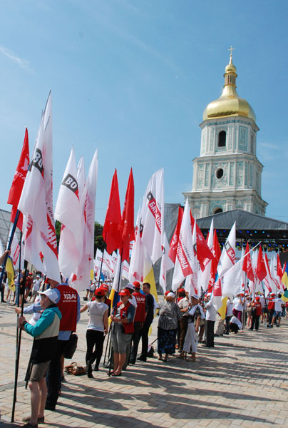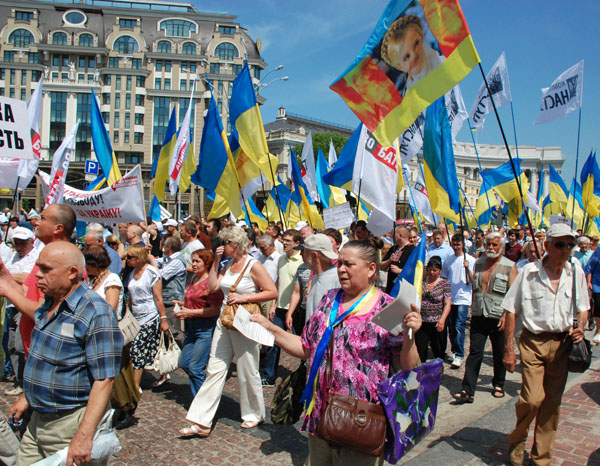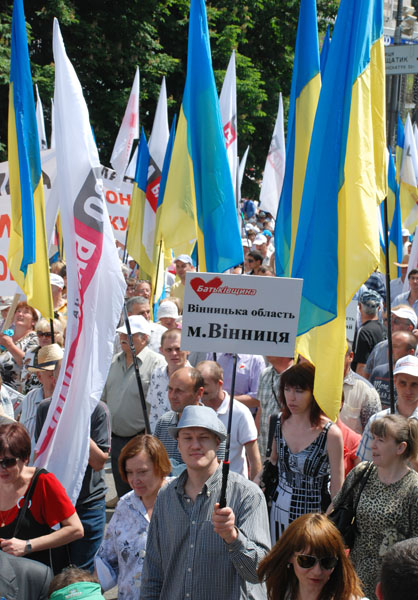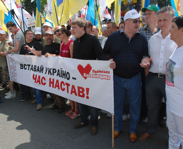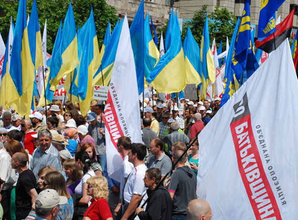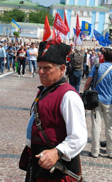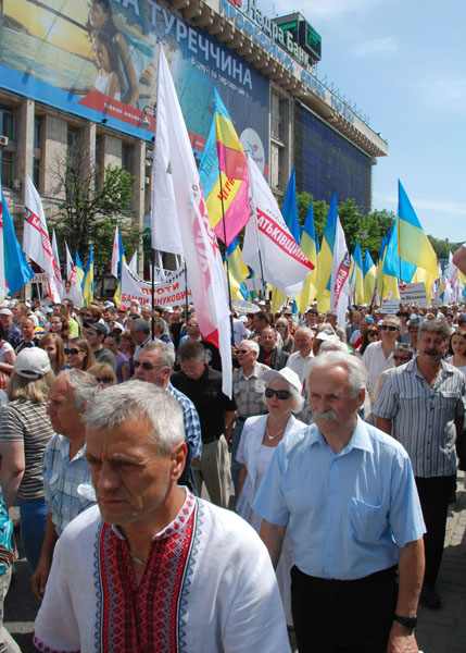 В отличие от площадки возле КМДА, где народ тихо и спокойно отмечал День Европы, Европейская площадь и кусок Крещатика спокойствием похвастаться не могли. Тут бурлила «Вставай Украина». Народу на этот марш оппозиции собралось преизрядно, причем не только из столицы, но и из многих уголков нашей прекрасной родины. Количество милиции тоже было весьма немалым, часть активно крутилась возле митингующих, а в переходе «Трубы» нервно курили несколько сот «беркутят».
