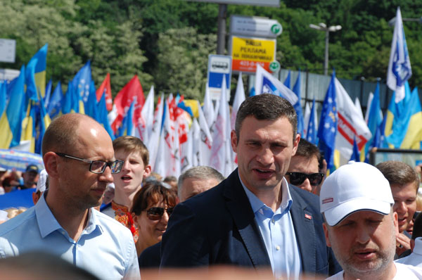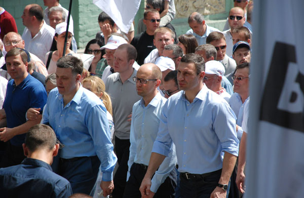 Наконец появились улыбающиеся и машущие руками вожди: Кличко, Тягнибок, Яценюк (в народе имеющие совместную подпольную кличку «три богатыря»), и немного потоптавшись на месте, колонна двинулась на Софиевскую площадь. Там уже с утра была установлена сцена и все было давно готово ко встрече единомышленников. Шли весело с шутками и прибаутками, среди которых по-прежнему преобладало пожелание смены власти.