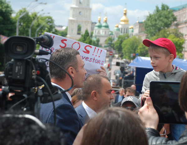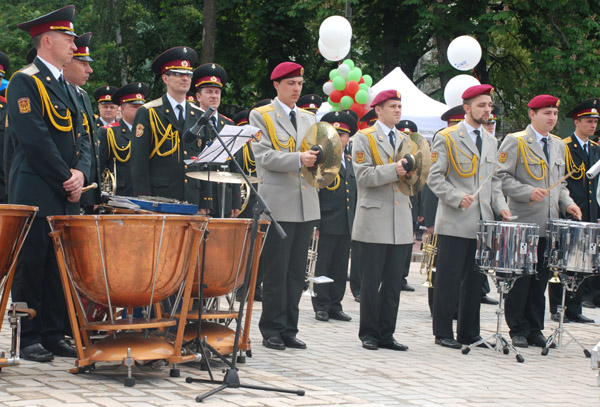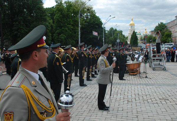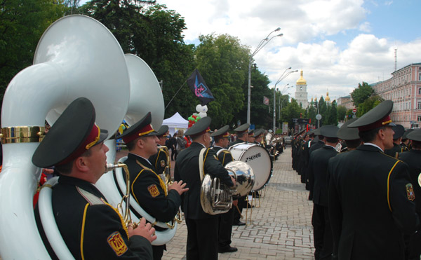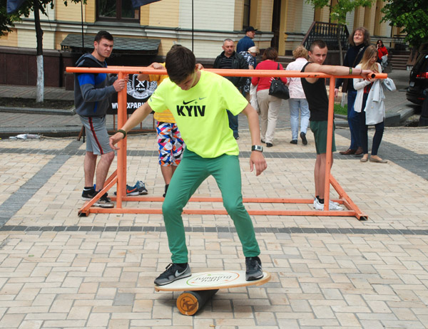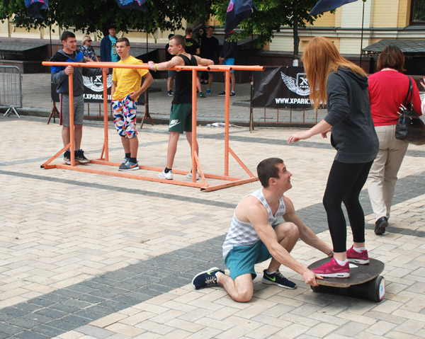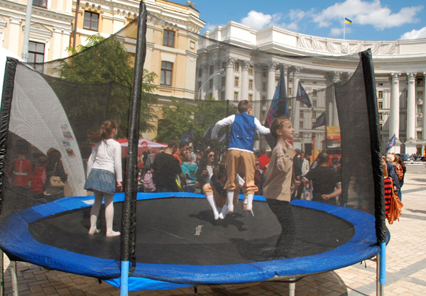 В одном месте играл военный оркестр. В другом — руководство Киева и страны толкало речи о стремлении в Евросоюз. Где-то перебрасывались регбийным мячом. Где-то прыгали на батуте, или упражнялись на брусьях.
