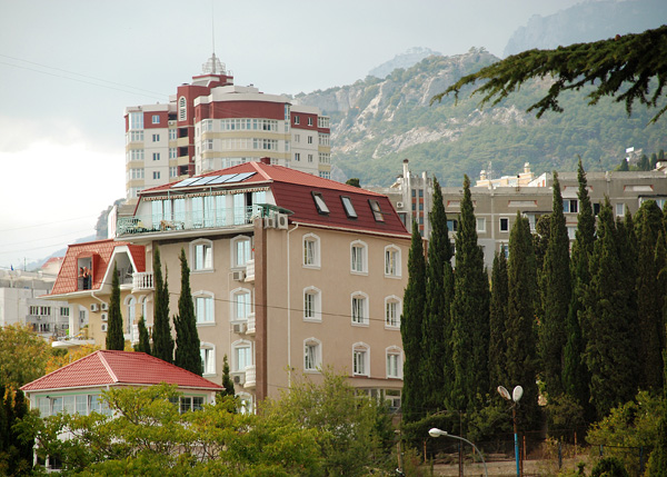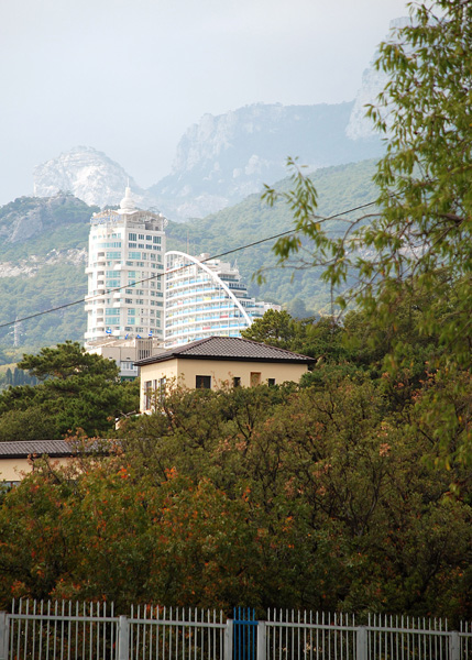 Сменяющие друг друга небольшие поселки, роскошные виллы, хайтековые здания, притулившиеся в тени скал, стройные кипарисы, строительные краны, канатные дороги, изысканные или облупленные корпуса санаториев.