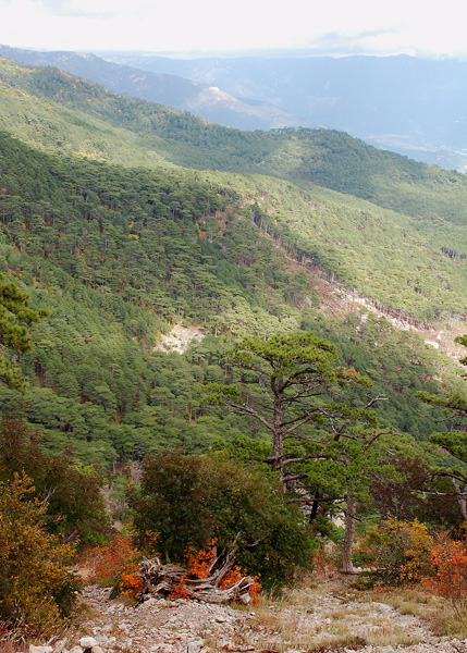 Но красота божественная. Вековые сосны соседствуют с целыми россыпями молоденьких ростков. Из-за камня кокетливо выглядывают нежные синие цветы. Между стройных рядов деревьев внезапно открываются шикарные панорамы Ялты или Мисхора. Каменные глыбы перемежаются глубокими оврагами. А воздух, пронизанный ароматами хвои и легким бризом с моря, окутывает тебя волшебными объятьями сильфиды.