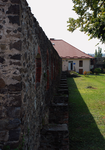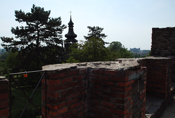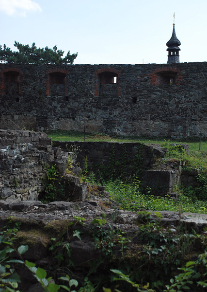 Справа от дорожки мы увидим остатки фундамента церкви Святого Юрия (1248), примечательной тем, что 24 апреля 1646 года здесь заключили Ужгородскую церковную унию. А также тем, что именно здесь Другеты устроили свою фамильную усыпальницу. Сама церковь сгорела в 1728-м, и через некоторое время о ее существовании забыли напрочь. Рассказывая страшилки о ведьминой яме, располагавшейся как раз на месте, где когда то возвышалась церковь. Тут будто бы держали обвиненных в колдовстве барышень, а одну из них даже сожгли в начале 18-го века. Подтверждений этим легендам нет никаких, а вот храм, в конце концов, откопали археологи уже при Союзе.